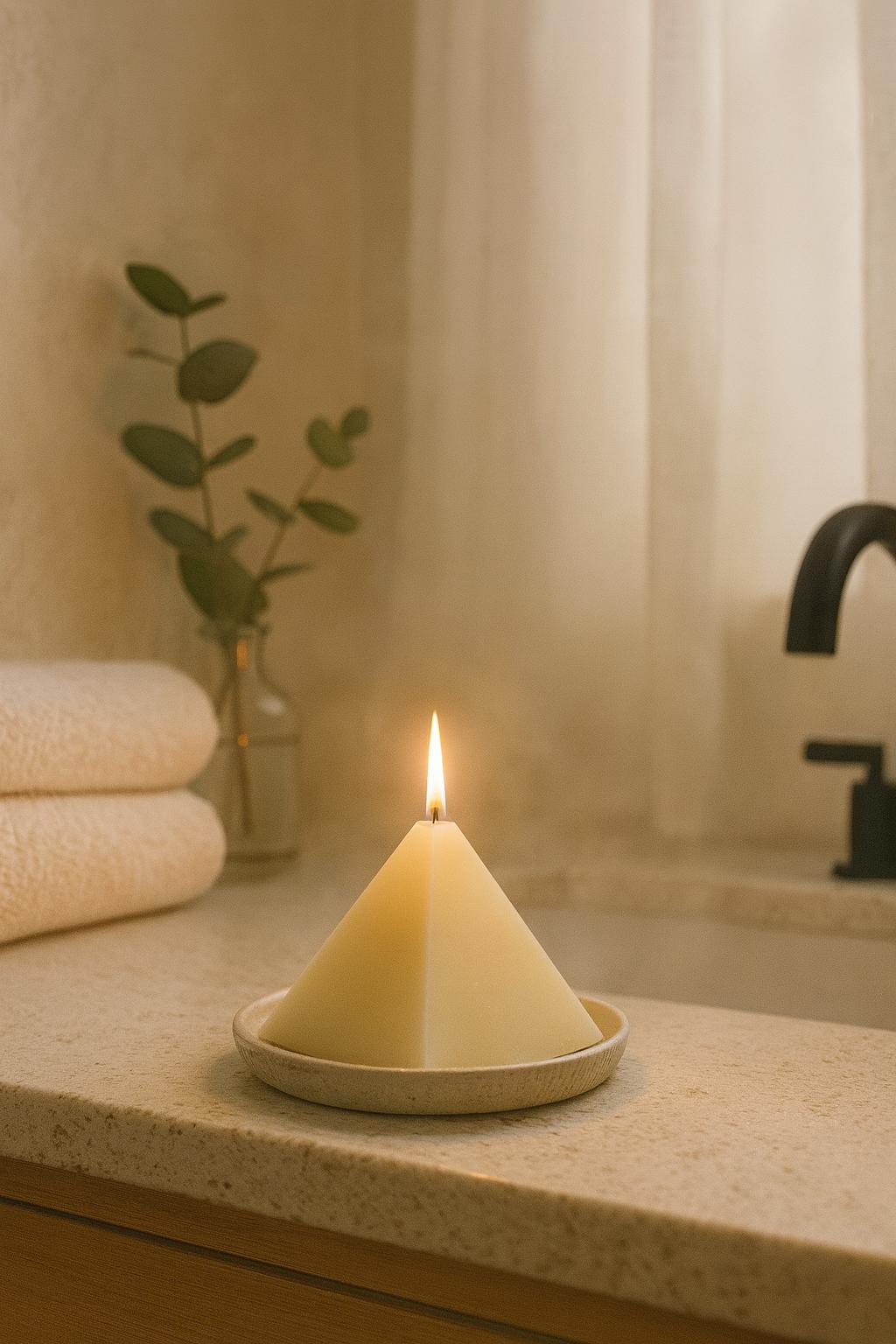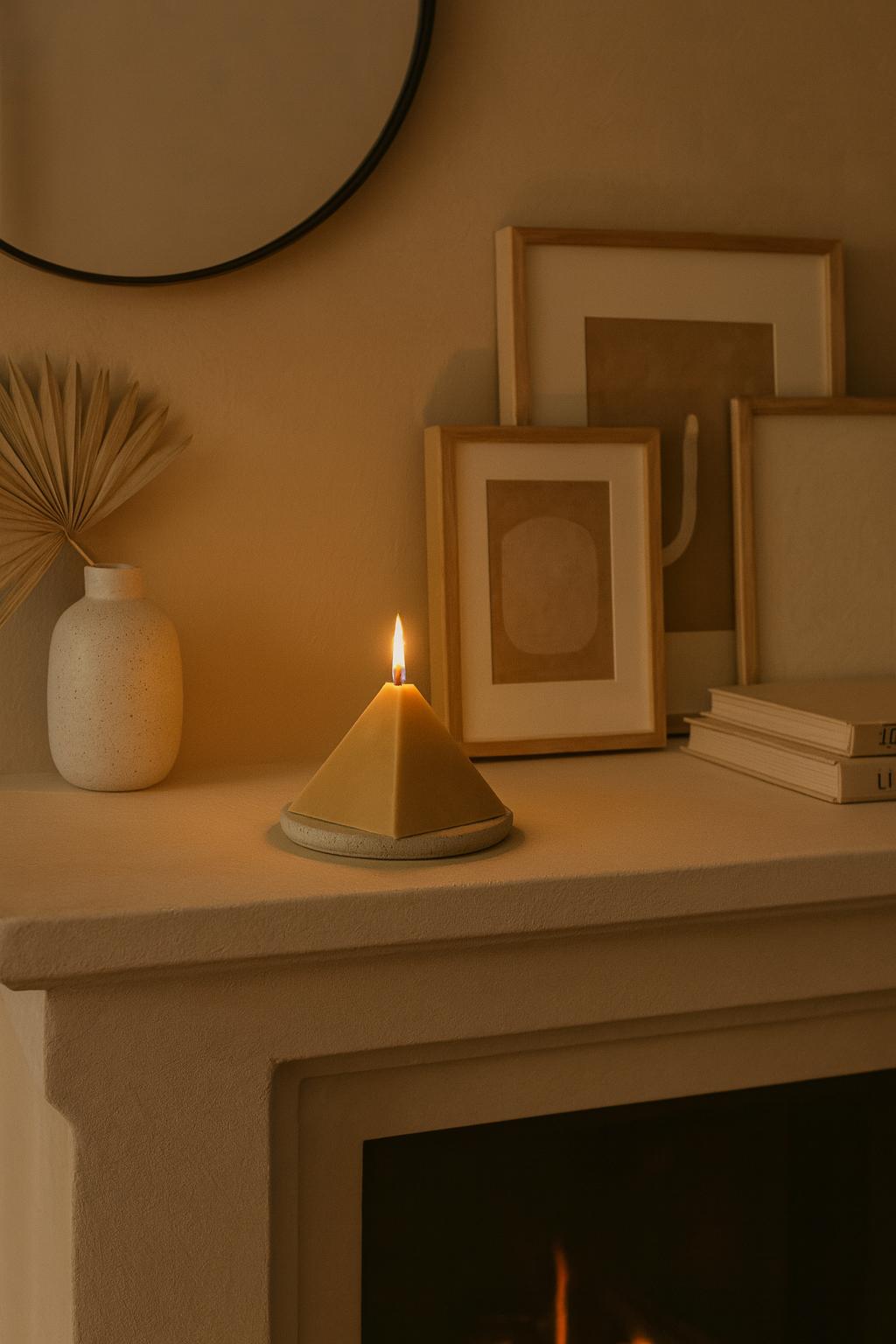 Bringe liebevolle Handarbeit und natürliche Eleganz in dein Zuhause mit der Pyramiden Kerze.